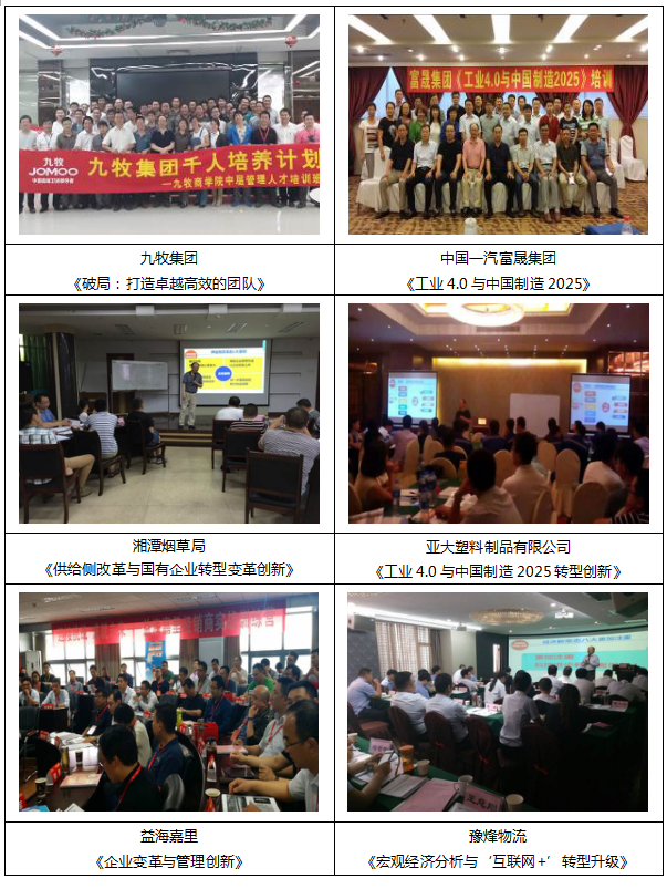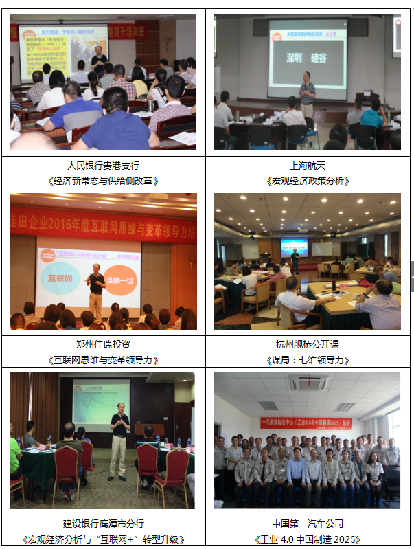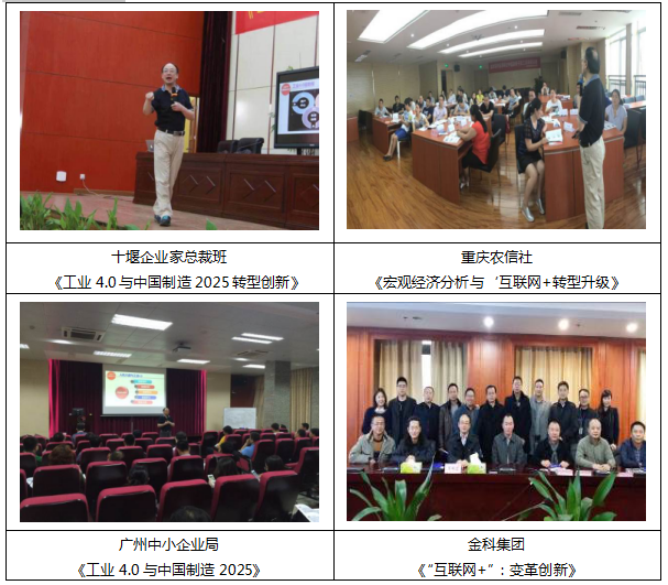 政府系統(tǒng):農(nóng)業(yè)部縣市長培訓(xùn)班、農(nóng)業(yè)部鄉(xiāng)鎮(zhèn)長培訓(xùn)班、湖北省發(fā)改委、湖北省科技廳、湖北省農(nóng)業(yè)廳、浙江省經(jīng)信委、廣東省中小企業(yè)局、共青團(tuán)湖北省委、湖北省政府天門市委、宜昌市政府、老河口市政府、安陸市政府、宜城市政府、洪湖市政府、固始縣政府、蘄春縣農(nóng)業(yè)局、麻城縣農(nóng)業(yè)局、羅田縣、東莞市公安局、農(nóng)業(yè)產(chǎn)業(yè)化龍頭企業(yè)高層培訓(xùn)班、洛陽企業(yè)家協(xié)會、佛山中小企業(yè)局、張掖市組織部、泰州市經(jīng)信委、重慶工商聯(lián)、湖南邵陽企業(yè)家協(xié)會……