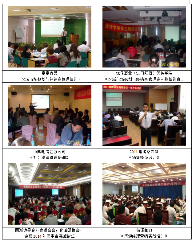 20年營銷管理經(jīng)驗 , 近10年咨詢培訓(xùn)經(jīng)驗,具備咨詢和實(shí)業(yè)雙重職業(yè)經(jīng)歷,課程全部源于實(shí)戰(zhàn)! 曾先后主導(dǎo)過紅牛維他命飲料、雅客食品、金冠食品、貴人鳥服裝、紅星美凱龍、塔牌紹興酒、繁清家具、雪花啤酒全國營銷體系培訓(xùn)項目兼首席營銷講師。先后培養(yǎng)內(nèi)訓(xùn)師30多名,平均每年度培訓(xùn)課時達(dá)600多,累計開發(fā)課程22門,其中《區(qū)域市場開發(fā)與經(jīng)銷商管理》課程,連續(xù)4年被選入紅牛系統(tǒng)中高層管理團(tuán)隊在崗培訓(xùn)必修課程(受眾達(dá)1600人次),同時被金冠食品、紅牛維他命飲料、繁清家具等選入年度培訓(xùn)必修課程,重復(fù)10次采購(受眾達(dá)2000人次)。