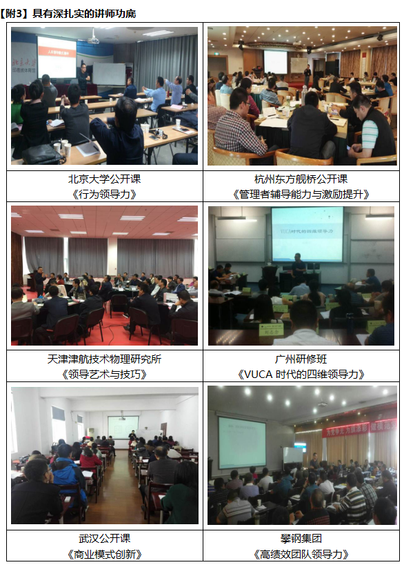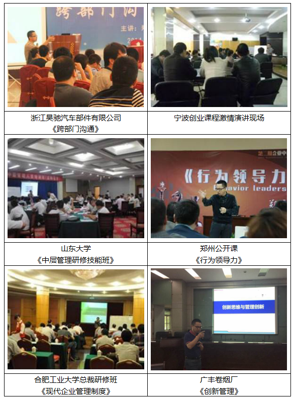 ——具有扎實(shí)的講師功底。2013年開始兼職講課,至2016年底共計(jì)講課360余天。終端服務(wù)對(duì)象主要有高校(總裁班)和企業(yè)(內(nèi)訓(xùn)課)兩大類: