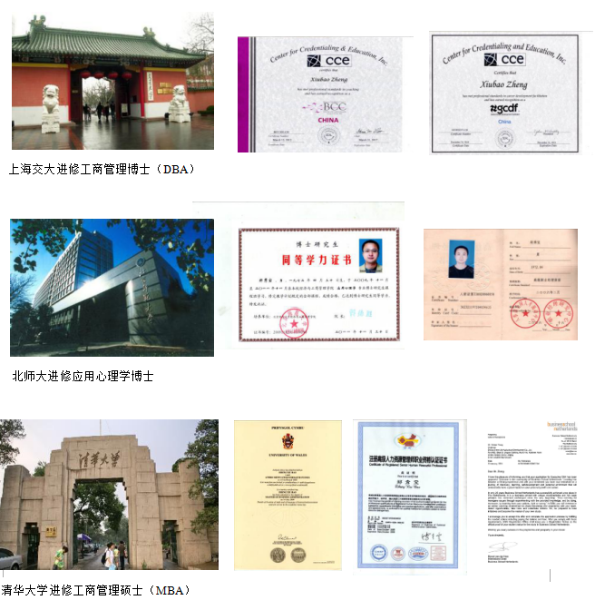 ——具有深厚的理論素養(yǎng)。將于今年畢業(yè)于荷蘭商學(xué)院(BSN)工商管理博士(DBA)專業(yè)層次,上海交通大學(xué)中外合作項(xiàng)目;已于2011年畢業(yè)于北京師范大字應(yīng)用心理學(xué)博士專業(yè)層次,國(guó)家同等學(xué)力項(xiàng)目;已于2009年畢業(yè)于英國(guó)威爾士大學(xué)(WALS)工商管理碩士(MBA)專業(yè)層次,清華大學(xué)中外合作項(xiàng)目。此外,持有以下相關(guān)證書:高級(jí)經(jīng)濟(jì)師、注冊(cè)高級(jí)人力資源管理師、國(guó)家高級(jí)職業(yè)經(jīng)理資質(zhì)、全球職業(yè)規(guī)劃師(GCDF)、全球生涯教練(BCC)、行動(dòng)學(xué)習(xí)促動(dòng)師等