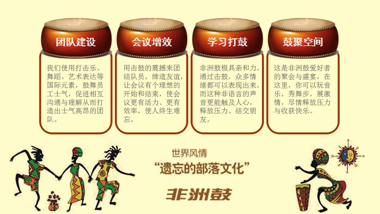 數(shù)百年來,所有文化均證明擊鼓是最 有效的團(tuán)隊打造活動。 鼓的歷史悠久,用途廣泛,在人們彼 此交往、組織協(xié)作、調(diào)劑精神,或緩和緊 張情緒等方面都有明顯的功用。非洲集體 鼓樂是一群人以各種敲擊樂器合奏奏出旋 律節(jié)奏。